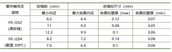 - 外徑為3.3mm-12.3mm等多種規(guī)格可選,收縮比可達(dá)1.2:1~1.5:1范圍,具體尺寸可按照客戶要求進(jìn)行定制。
